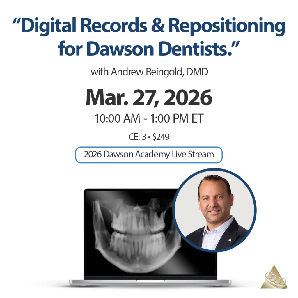 The Dawson Academy is an ADA CERP Recognized Provider. ADA CERP is a service of the American Dental Association to assist dental professionals in identifying quality providers of continuing dental education. ADA CERP does not approve or endorse individual courses or instructors, nor does it imply acceptance of credit hours by boards of dentistry. The Dawson Academy designates this activity for 4 credit hours continuing education credits.